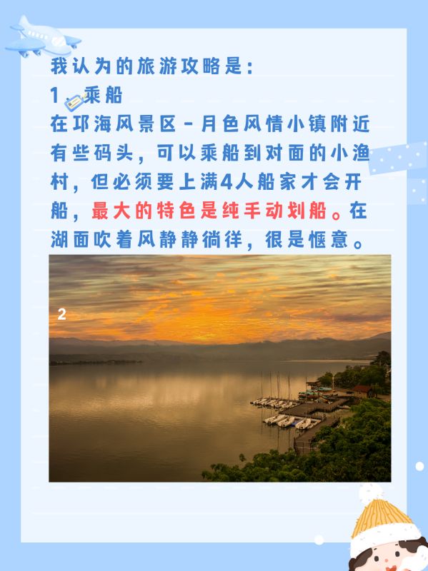 1、乘船 在邛海风景区-月色风情小镇附近有些码头,可以乘船到对面的小渔村,但必须要上满4人船家才会开船,最大的特色是纯手动划船。