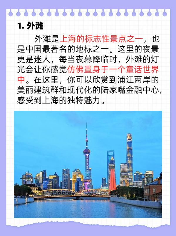 外滩是上海的标志性景点之一,也是中国最著名的地标之一。这里的夜景更是迷人,每当夜幕降临时,外滩的灯光会让你感觉仿佛置身于一个童话世界中。在这里,你可以欣赏到浦江两岸的美丽建筑群和现代化的陆家嘴金融中心,感受到上海的独特魅力。