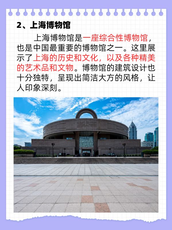 上海博物馆是一座综合性博物馆,也是中国最重要的博物馆之一。这里展示了上海的历史和文化,以及各种精美的艺术品和文物。博物馆的建筑设计也十分独特,呈现出简洁大方的风格,让人印象深刻。