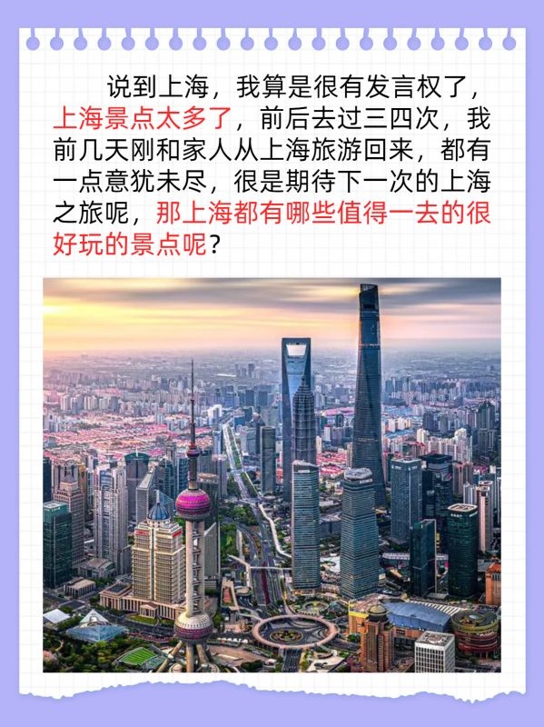 说到上海,我算是很有发言权了,上海景点太多了,前后去过三四次,我前几天刚和家人从上海旅游回来,都有一点意犹未尽,很是期待下一次的上海之旅呢,那上海都有哪些值得一去的很好玩的景点呢?