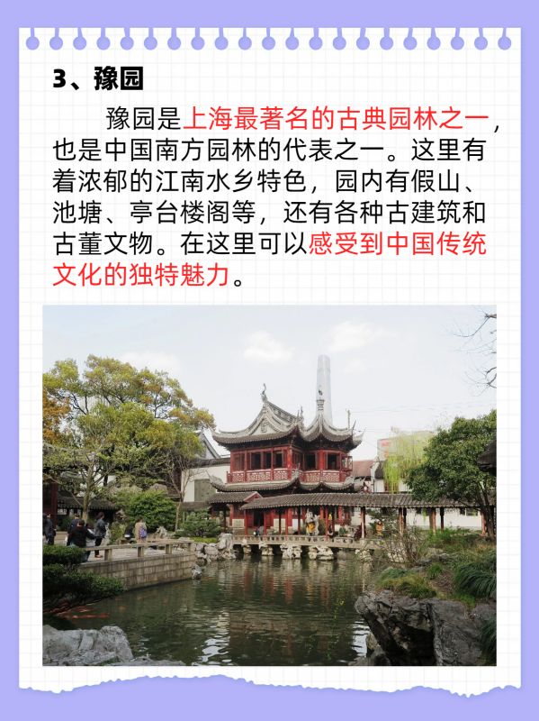 豫园是上海最著名的古典园林之一,也是中国南方园林的代表之一。这里有着浓郁的江南水乡特色,园内有假山、池塘、亭台楼阁等,还有各种古建筑和古董文物。在这里可以感受到中国传统文化的独特魅力。