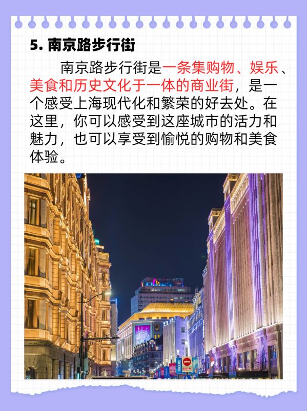 南京路步行街是一条集购物、娱乐、美食和历史文化于一体的商业街,是一个感受上海现代化和繁荣的好去处。在这里,你可以感受到这座城市的活力和魅力,也可以享受到愉悦的购物和美食体验。