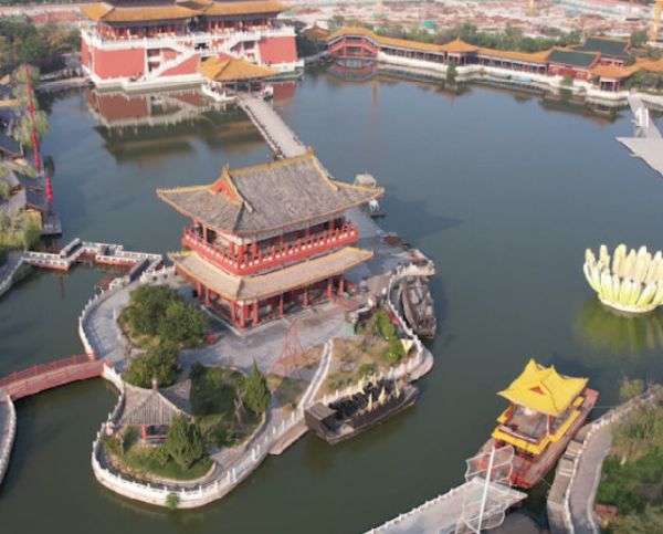 该园占地面积500余亩,其中水面150亩,拥有大小古船50余艘,各种宋式房屋400余间,形成了中原地区最大的气势磅礴的宋代古建筑群,整个景区内芳草如茵,古音萦绕,钟鼓阵阵,形成一派“丝柳欲拂面,鳞波映银帆,酒旗随风展,车轿绵如链”的栩栩如生的古风神韵。