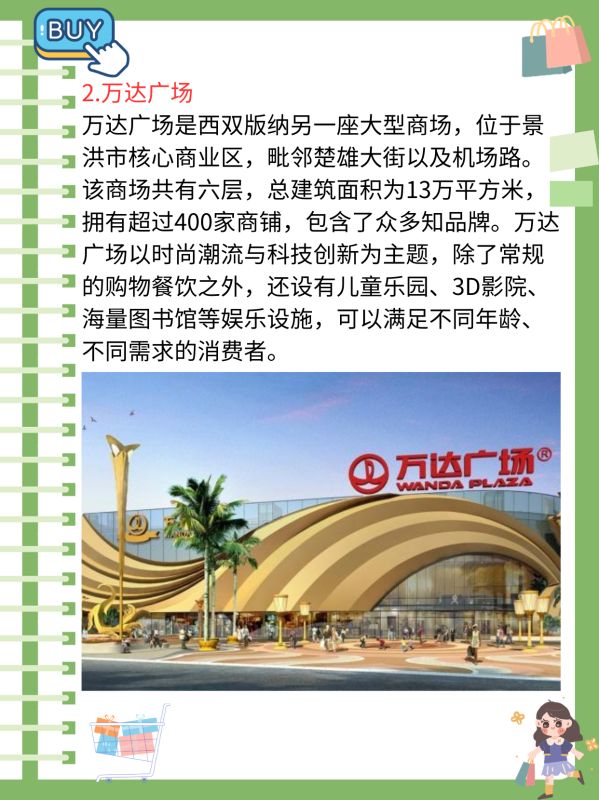 万达广场是西双版纳另一座大型商场,位于景洪市核心商业区,毗邻楚雄大街以及机场路。该商场共有六层,总建筑面积为13万平方米,拥有超过400家商铺,包含了众多知品牌。