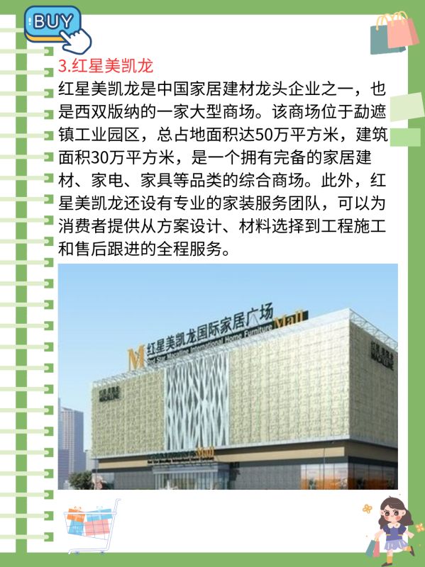 红星美凯龙是中国家居建材龙头企业之一,也是西双版纳的一家大型商场。该商场位于勐遮镇工业园区,总占地面积达50万平方米,建筑面积30万平方米,是一个拥有完备的家居建材、家电、家具等品类的综合商场。