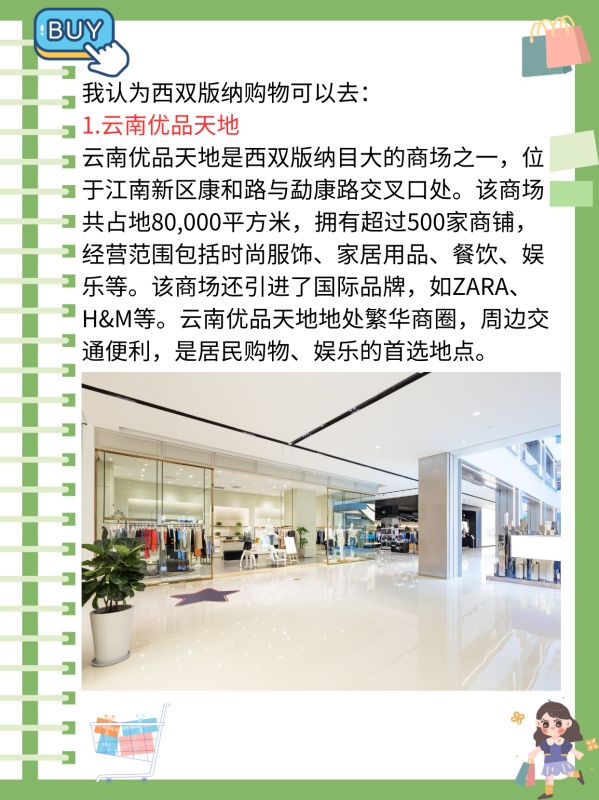 云南优品天地是西双版纳目大的商场之一,位于江南新区康和路与勐康路交叉口处。该商场共占地80,000平方米,拥有超过500家商铺,经营范围包括时尚服饰、家居用品、餐饮、娱乐等。