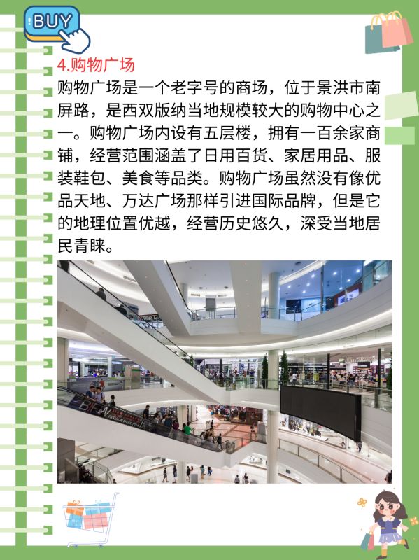 购物广场是一个老字号的商场,位于景洪市南屏路,是西双版纳当地规模较大的购物中心之一。购物广场内设有五层楼,拥有一百余家商铺,经营范围涵盖了日用百货、家居用品、服装鞋包、美食等品类。
