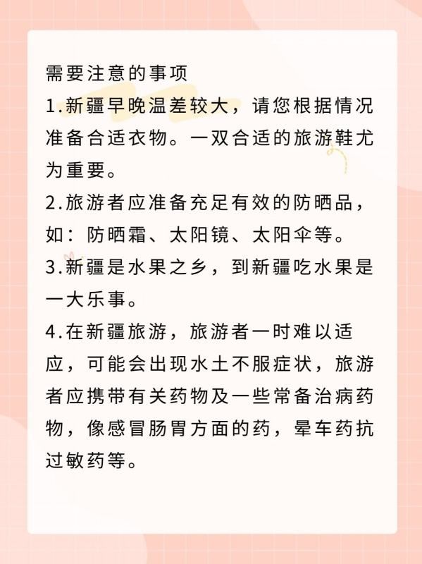 1、天气:俗话说“早穿棉袄午穿纱,围着火炉吃西瓜。” 新疆的天气多变,一天能经历四季变换,请一定准备好防晒、防寒、防雨装备;2、衣着:新疆昼夜温差大,即使是7、8月份,夜晚也比较冷,穿衣应以透气性好、保暖的服饰为主。而且,裤子也尽量穿宽松、棉质地的。如果你想骑马,切忌光脚穿凉鞋,用不了多久,马镫就会磨破你的脚。3、防晒防暑:新疆部分地区海拔较高,紫外线照射强烈,所以请带好防晒物品(如高度数的防晒霜、墨镜),最好是长袖长裤,否则,一天下来绝对会晒掉一层皮。此外吐鲁番地区夏季最高气温可达40度以上,应配备清热防暑的药物或冲剂;4、交通:新疆平直的公路容易视觉疲劳,也容易超速;像天山达坂等地的公路非常险峻,路况也很差,小心驾驶;而且新疆绝大部分是牧区,公路上经常会有牛羊等牲畜,开车撞到牲畜是要赔偿、道歉的。自驾游的朋友请千万注意安全!此外,路上时间可能会比较长,如果有晕车的旅行者需要注意。5、租车:租车最好有多个会开车的,因为新疆幅员辽阔,各风景区间相隔五六百公里很正常,一个人开车会很累。通常三、四人合租一辆越野吉普,租15天,500-600元/天,游遍全疆租车费用约需7500-9000元左右,平均1875-2250元/人。同时由于新疆高速路车比较少,很多人会超速行驶,一定要注意安全。6、购物:新疆卖东西都是以公斤论的,如果你一开口问多少一斤就等着被宰钱吧。即使对方说的是多少钱1斤,含义也是多少钱1公斤的意思,千万别搞错了,多付给人家一倍的钱。7、住宿:总体来讲,新疆除乌鲁木齐、克拉玛依等少数城市有现代化的酒店之外,其他地方的住宿条件都比较简陋而且价格昂贵,很多地方都没有空调,有些地方甚至没有淋浴和独立卫生间。我们在去之前一定要有这些基本的认识,投宿具有民族特色的民居里,虽然条件简陋,但从另外一个角度来看,也是一种别样的体验。当然,部分景区也有装修豪华的现代化酒店,但是据说价格都是三位数接近四位数。人烟稀少的偏僻地区,住宿不是十分方便,有些游人罕至的地方不但没有宾馆或招待所,甚至没有居民,只有自己配备 汽车 等其他交通工具和自带帐篷。8、银行:在每个州的首府各类银行还是很多的,如中国银行、建设银行、农业银行等等。但是到了县、乡就很少有银行了,所以要准备一定的现金。大部分地方都可以微信支付或者支付宝支付,不过到了一些信号差且偏僻的地方就不一定了,所以请备好足够的现金,并分开几份存放以降低丢失风险。9、时差:新疆与内地有两个小时的时差。多数服务机构与政府部门的上下班时间与内地不同,早上上班时间一般在10点或11点,中午休息时间较长,一般在15点之后才上班。另外,虽然客运站都以北京时间为准,但当地少数民族司机习惯说新疆时间,在包车、乘车时尤其要注意确认时间。10、水土不服:新疆的水是偏碱性的,比较硬,所以不习惯的人喝了会便秘。东部人民吃新疆的各种羊肉制品奶制品容易拉肚子,太新鲜也有坏处。同理水果也糖分远超内地,不要一次吃太多。11、安检:新疆的安检很严格(而且中途可能还要再次、多次安检)。在机场,身上的口袋要求掏空、脱鞋子之后,还要扫描脚底,在登机通道处还有二次安检;火车站、 汽车 站这些交通枢纽一般都要过3-4次安检,所以不管是乘飞机、火车、 汽车 ,至少提前一个小时去。即使是去超市、巴扎、集市,只要是人多的地方都要过安检。12、因新疆气候干燥,特提醒最好不要戴隐形眼镜。尤其一些地区住宿条件不佳,冲洗等都不大方便,如果要带也多带几副后备。13、边境:新疆有很多军事禁区、国界之类的地方是禁止游览、禁止拍照的,这点千万要记清楚,否则会招来不必要的麻烦;到白哈巴、霍尔果斯、红其拉甫等地,要在布尔津县、霍城县和塔什库尔干县的武警边防大队办理边防通行证,也可以提前在你户口本所属派出所办理,否则去到当地再办理的话可能要排队排很久。14、保险:由于事故和疾病在旅途中随时可能发生,特别是去特殊的区域开展特殊活动,如高山攀登、沙漠穿越、古道徒步等等,即使你体格健壮,身手敏捷,旅行前也最好有相关的保险。15、如果有机会的话,建议骑骑马。伊犁马是新疆最好的马,价位在50多(一小时)的可以讲价(如果会讲的话会压低很多)。记住,骑马的话最好不要去景区,因为太贵。如果是小孩子在骑的话,倒是可以压压价。但官方经营的话就不行了。