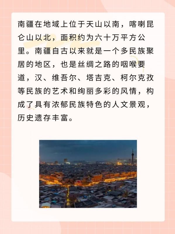 南疆在地域上位于天山以南,喀喇昆仑山以北,面积约为六十万平方公里。南疆自古以来就是一个多民族聚居的地区,也是丝绸之路的咽喉要道,汉、维吾尔、塔吉克、柯尔克孜等民族的艺术和绚丽多彩的风情,构成了具有浓郁民族特色的人文景观,历史遗存丰富。