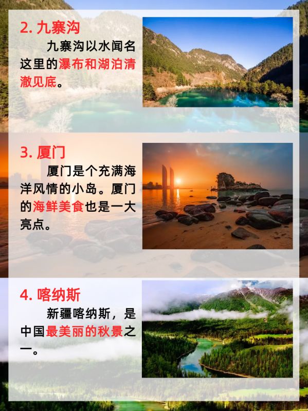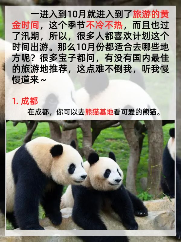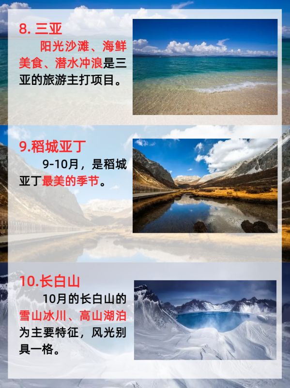 一进入到10月就进入到了旅游的黄金时间,这个季节不冷不热,而且也过了汛期,所以很多人都喜欢计划这个时间出游。那么10月份都适合去哪些地方呢?很多宝子都问有没有国内最佳的旅游地推荐,这点难不倒我,听我慢慢道来~