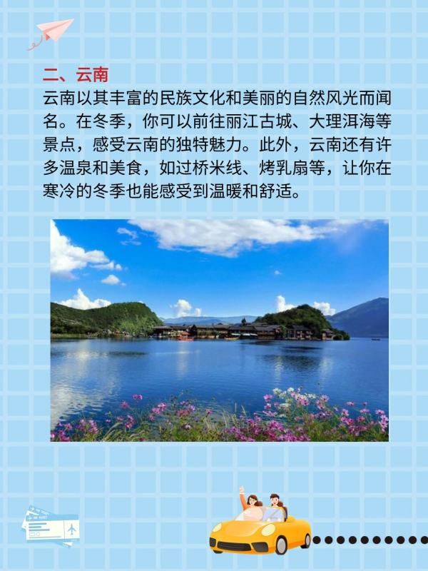 云南以其丰富的民族文化和美丽的自然风光而闻名。在冬季,你可以前往丽江古城、大理洱海等景点,感受云南的独特魅力。此外,云南还有许多温泉和美食,如过桥米线、烤乳扇等,让你在寒冷的冬季也能感受到温暖和舒适。