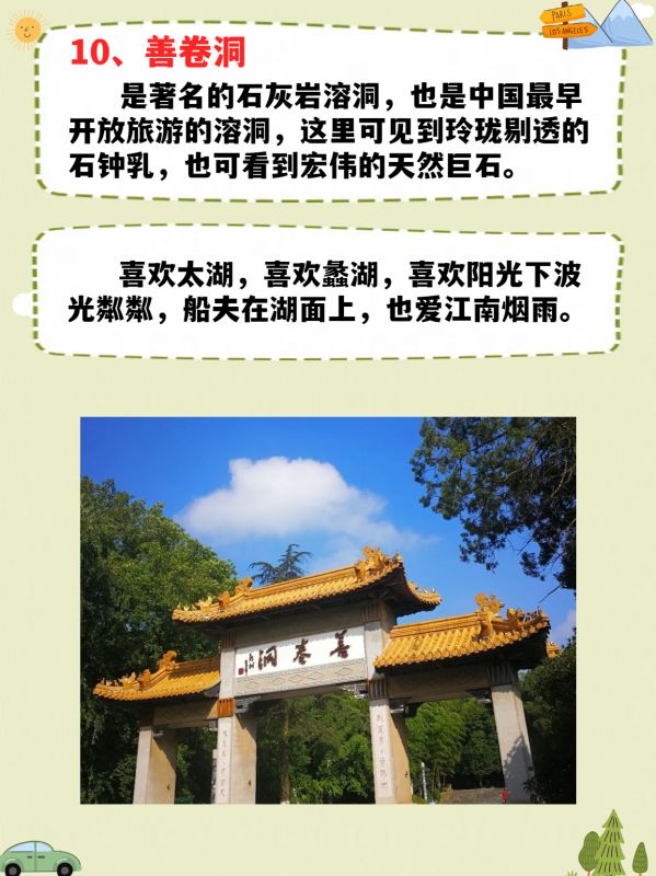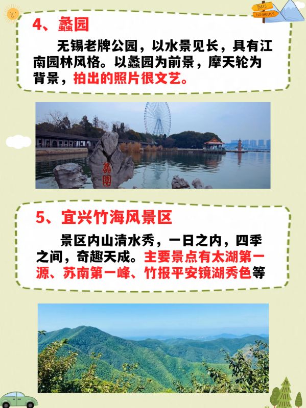 我觉得无锡旅游风光优美,景点丰富,是个值得一游的地方。以下景点代表了无锡的自然风光和历史文化,可根据个人兴趣和时间安排选择合适的景点。