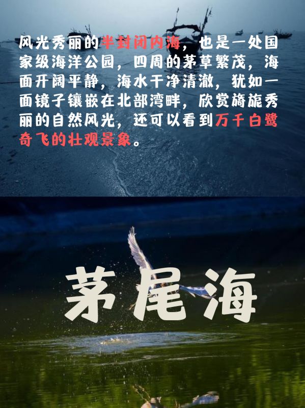 风光秀丽的半封闭内海,也是一处国家级海洋公园,四周的茅草繁茂,海面开阔平静,海水干净清澈,犹如一面镜子镶嵌在北部湾畔,欣赏旖旎秀丽的自然风光,还可以看到万千白鹭奇飞的壮观景象。