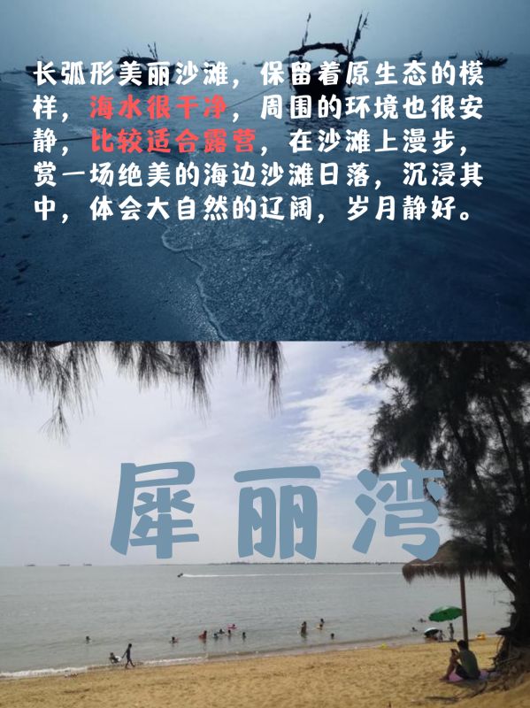 长弧形美丽沙滩,保留着原生态的模样,海水很干净,周围的环境也很安静,比较适合露营,在沙滩上漫步,赏一场绝美的海边沙滩日落,沉浸其中,体会大自然的辽阔,岁月静好。