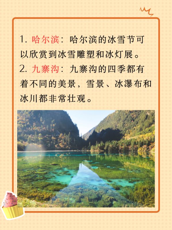 2. 九寨沟:九寨沟的四季都有着不同的美景,但冬季的九寨沟更是别有一番风味。这里的雪景、冰瀑布和冰川都非常壮观,让人仿佛置身于仙境之中。