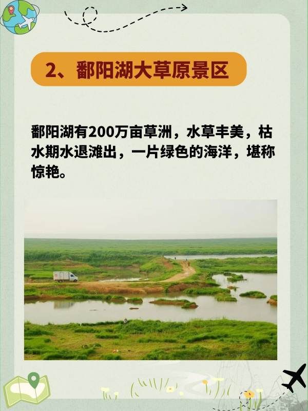 1、鄱阳湖国家湿地公园,是以湿地为主体景观,集湖泊、河流、草洲、泥滩、岛屿等其他类型的复合型湿地公园。是世界六大湿地之一,也是亚洲湿地面积最大、湿地物种最丰富的国家级湿地公园,国家4A级景区;
