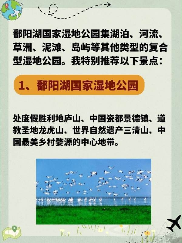 鄱阳湖国家湿地公园集湖泊、河流、草洲、泥滩、岛屿等其他类型的复合型湿地公园。我特别推荐以下景点: