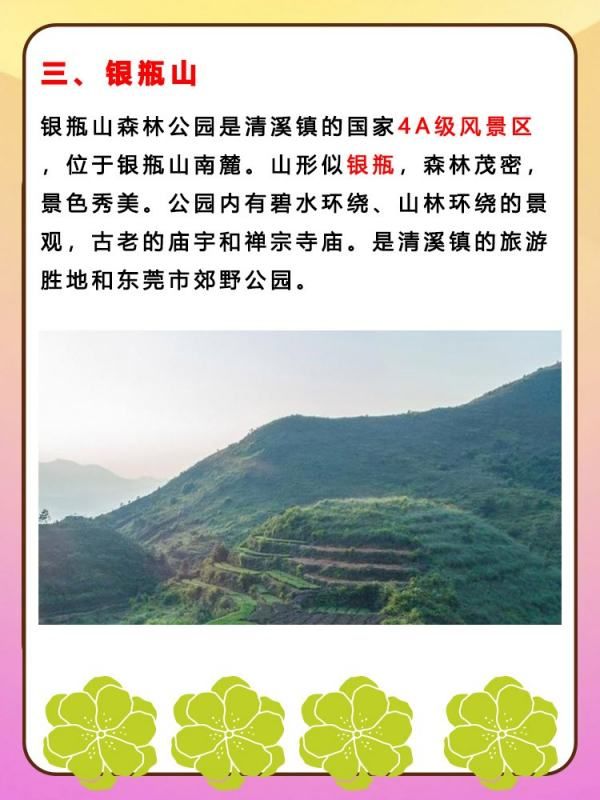 银瓶山森林公园,位于银瓶山南麓,森林茂密,景色秀美。内有碧水环绕、山林环绕的景观和古老的庙宇、禅宗寺庙。是清溪镇的旅游胜地和东莞市郊野公园。