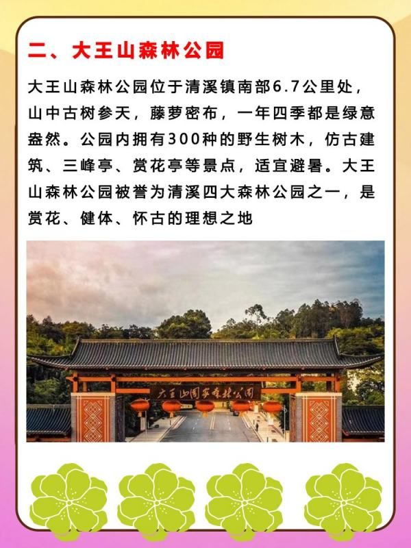 大王山森林公园,位于清溪镇南部6.7公里处。古树参天,藤萝密布,适宜避暑。被誉为清溪四大森林公园之一,赏花、健体、怀古的理想之地。