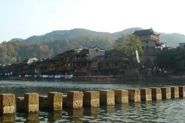 凤凰古城的标志性景点,是一条由两排独立的方块石墩形成的跳岩。这座跳岩位于沱江之上,正对着北门城楼,是游客拍摄的最佳取景点。当您经过这里时,需要一步一“跳”,脚下是清澈的沱江,颇具刺激。跳岩也是凤凰最受欢迎的拍摄点之一,站在岩上,可以欣赏到广阔的沱江和美丽的景色。