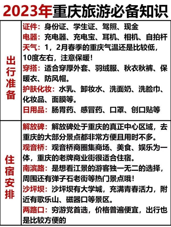 天气: 1, 2月春季的重庆气温还是比较低,10度左右, 注意保暖!