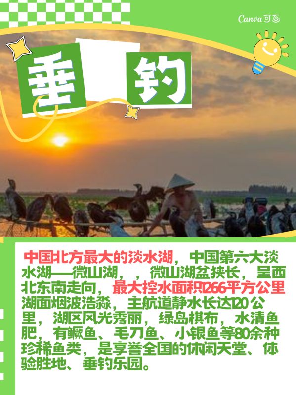 中国北方最大的淡水湖,中国第六大淡水湖——微山湖,,微山湖盆狭长,呈西北东南走向,最大控水面积1266平方公里湖面烟波浩淼,主航道静水长达120 公里,湖区风光秀丽,绿岛棋布,水清鱼肥,有鳜鱼、毛刀鱼、小银鱼等80余种珍稀鱼类,是享誉全国的休闲天堂、体验胜地、垂钓乐园