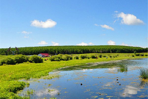 七星湖湿地公园塞罕坝国家森林公园的重点旅游风景点,位于机械林场北,在当地称为活泡子。公园被环抱于青山绿树中,早在康熙年间就有记载,原是七个小湖,如天上北斗,因此得名。湿地公园如今通为一体,大面积野花遍地的水草滩,虽是活动的浮层,但其底层仍是湖水,湖面上是相联的流动整体。为了保护湖的天然性,上面架了木制浮桥,并建立了木屋。