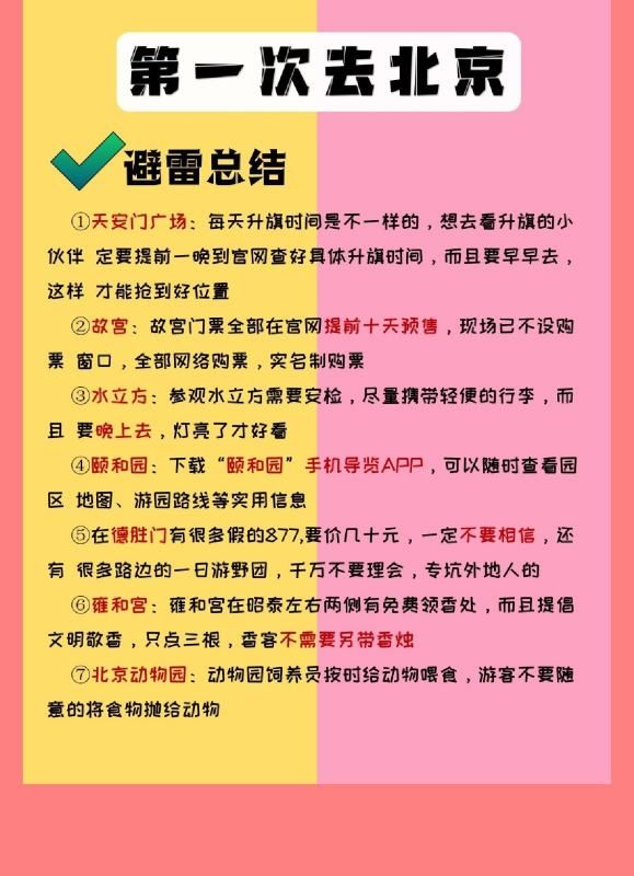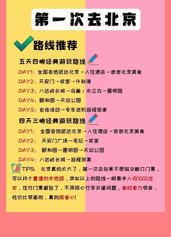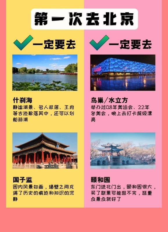 五天四晚经典游玩路线DAY 1:全国各地抵达北京→八住酒店→尝尝北京美食DAY 2:天安门一故宫→什刹海DAY 3:八达岭长城→鸟巢/水立方→圆明园DAY 4:颐和园一天坛公园