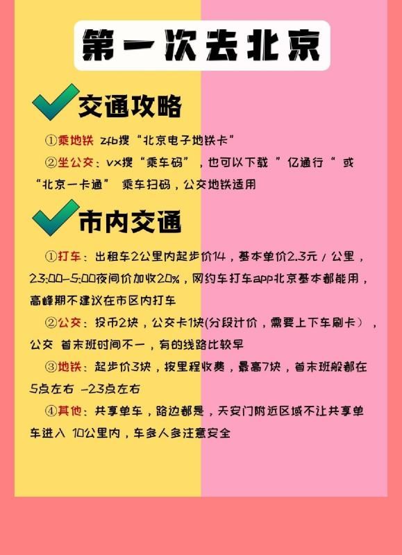 ①打车:出租车2公里内起步价14,基本单价2.3元/公里,2.3:00-5:00夜间价加收20%, 网约车打车app北京基本都能用,高峰期不建议在市区内打车