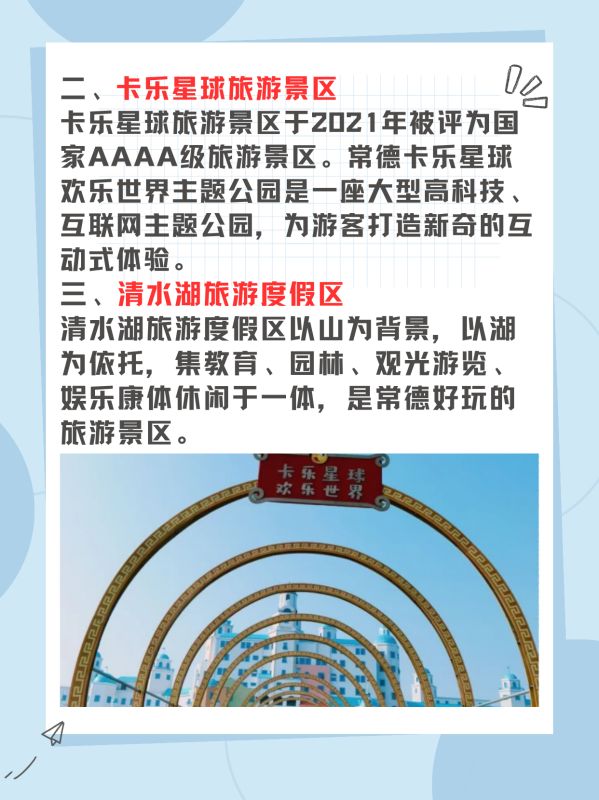 早上:首先,你可以从常德市区出发,前往柳叶湖。柳叶湖是湖南省最大的人工湖泊,湖水清澈,湖畔绿树成荫,是一个非常适合休闲散步的地方。在这里,你可以欣赏到湖光山色的美景,感受湖南的自然风光。