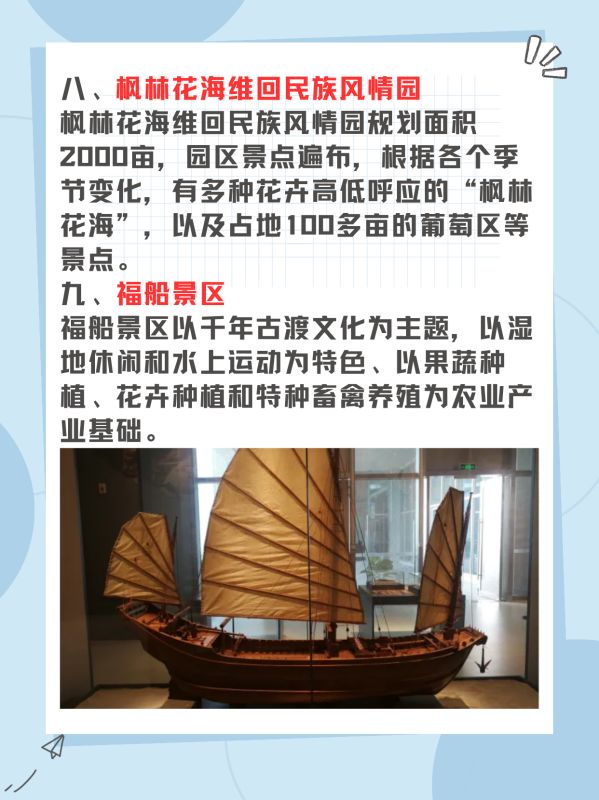 福船景区以千年古渡文化为主题,以湿地休闲和水上运动为特色、以果蔬种植、花卉种植和特种畜禽养殖为农业产业基础。