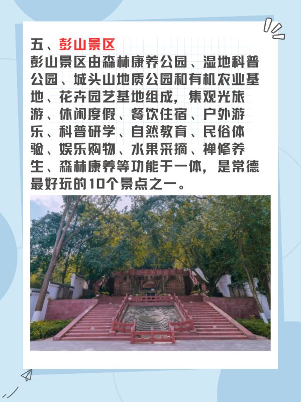 彭山景区由森林康养公园、湿地科普公园、城头山地质公园和有机农业基地、花卉园艺基地组成。