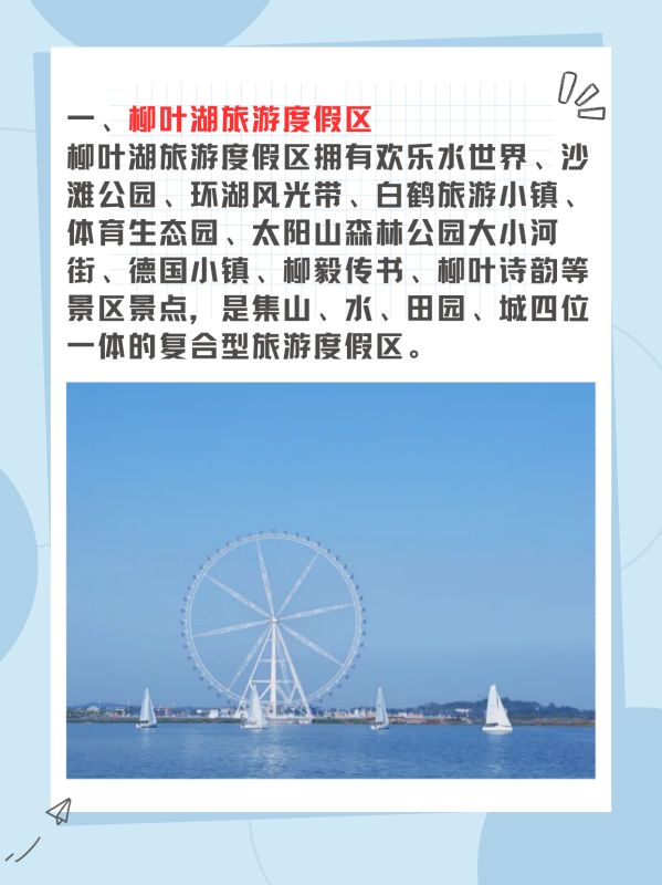 柳叶湖旅游度假区拥有欢乐水世界、沙滩公园、环湖风光带、白鹤旅游小镇、体育生态园、太阳山森林公园大小河街、德国小镇、柳毅传书、柳叶诗韵等景区景点。
