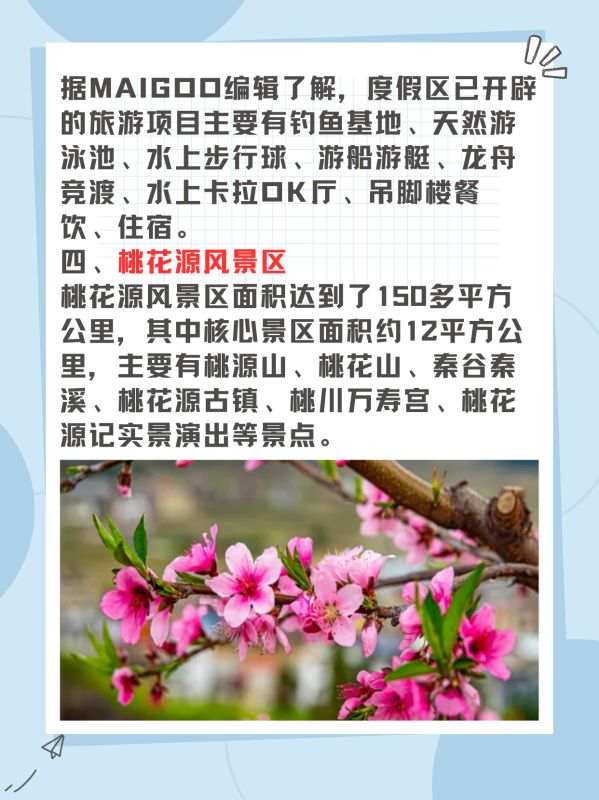 下午:午餐后,你可以前往常德的另一个著名景点——桃花源。桃花源是中国著名的人文景观,被誉为“人间仙境”。在这里,你可以欣赏到美丽的桃花,感受古人笔下的“世外桃源”的意境。