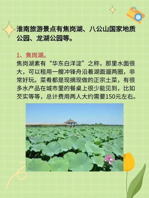 1. 龙湖公园:位于淮南市区,是一处集自然景观、人文景观和休闲娱乐于一体的综合性公园。公园内有湖泊、山丘、亭台楼阁等景观,环境优美,是市民休闲的好去处。