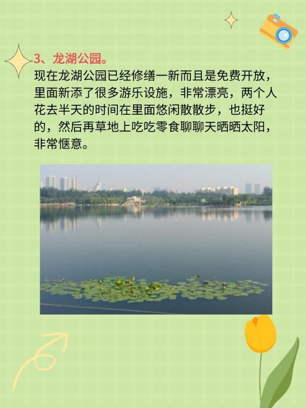 现在龙湖公园已经修缮一新而且是免费开放,里面新添了很多游乐设施,非常漂亮,两个人花去半天的时间在里面悠闲散散步,也挺好的,然后再草地上吃吃零食聊聊天晒晒太阳,非常惬意。