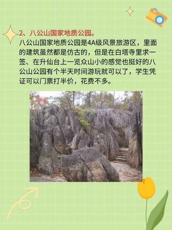 八公山国家地质公园是4A级风景旅游区,里面的建筑虽然都是仿古的,但是在白塔寺里求一签、在升仙台上一览众山小的感觉也挺好的八公山公园有个半天时间游玩就可以了,学生凭证可以门票打半价,花费不多。