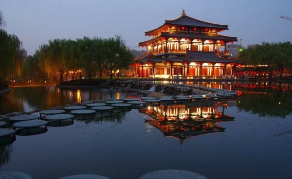 大唐芙蓉园在大雁塔东南侧,是在原唐代芙蓉园遗址以北,仿照唐代皇家园林式样重新建造的,是中国第一个全方位展示盛唐风貌的大型皇家园林式文化主题公园。