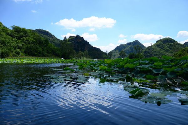 这里的核心景区有165平方千米,湖泊与湿地面积达数平方千米,有五十多个大小湖泊相连贯通,四万多亩野生荷花婀娜多姿。每到夏天,湖面上开满了各色的荷花,红的,粉的,白的,争奇斗艳。近处的荷花,远处的石山峰林,映衬在蓝天白云之下,构成了一幅美丽的画卷。