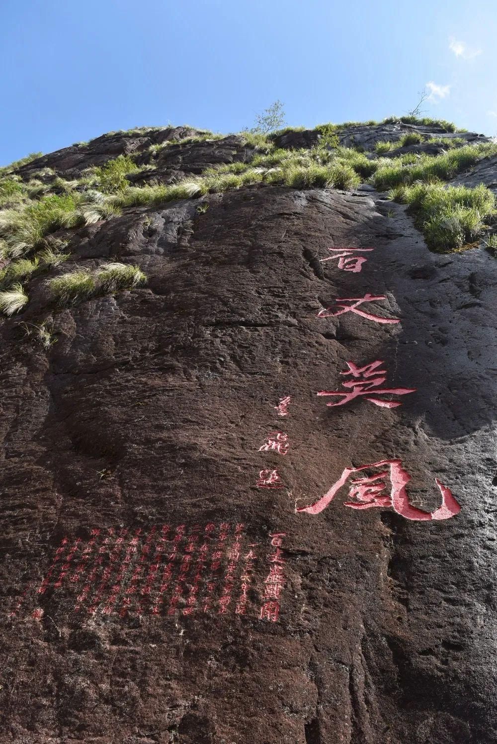 叶飞副委员长在此题词:“百丈英风”四大字。1936年10月,闽东独立师第三纵队在虎贝东源遭到国民党保安团三个连的包围,激战中,部分红军为了抢占百丈岩阻击敌人,掩护主力部队突围,最后剩下九名战士,弹尽援绝,纵身跳崖,壮烈牺牲。