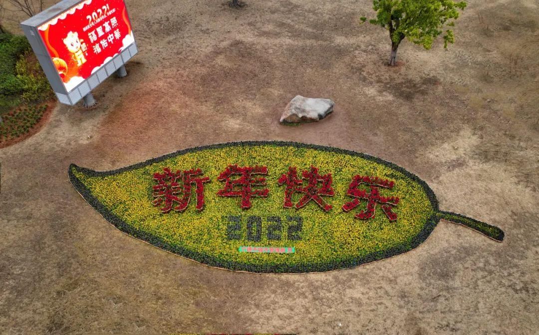 在公园一隅,用各色花卉妆扮出一片绿意盎然的树叶造型“新年快乐”主题花镜,用鲜红的一品红拼成“新年快乐”四个大字,洋溢着温暖的脉动。