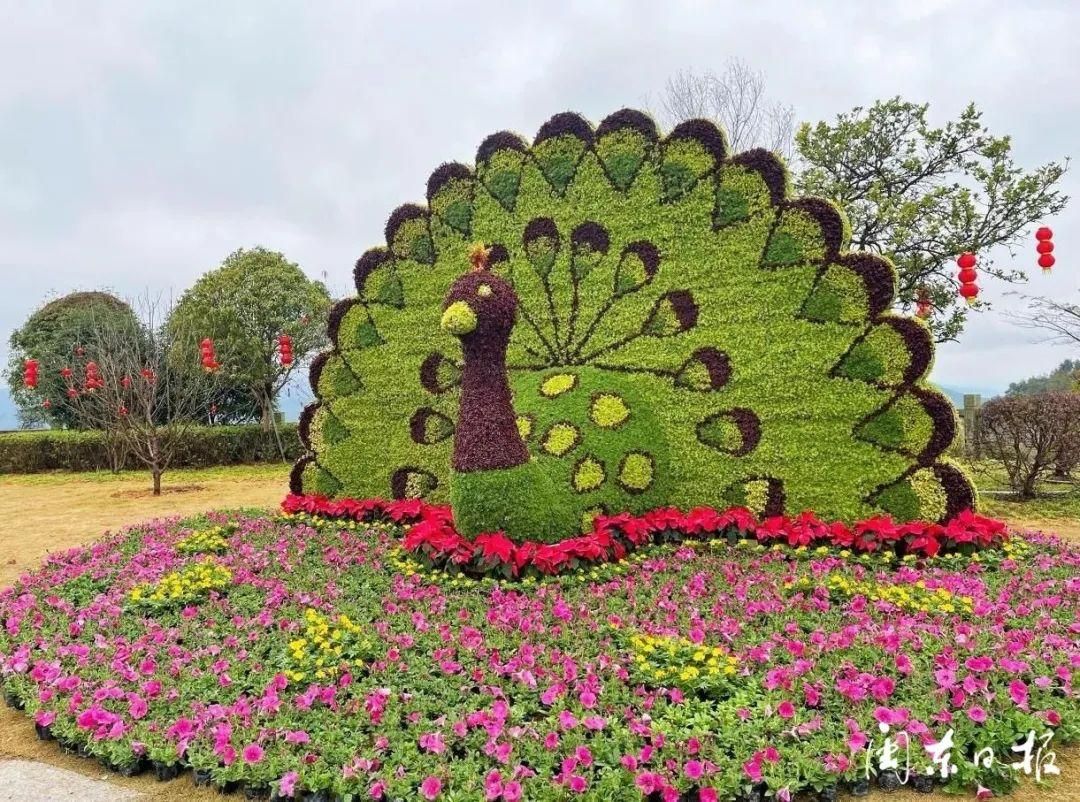 “孔雀”主题绿雕位于靖海楼园区,主体高3.5米,长度6米。孔雀作为“百鸟之王”,寓意着吉祥、幸福、高洁华贵,通过绿雕配以花镜,营造花团锦簇的效果。