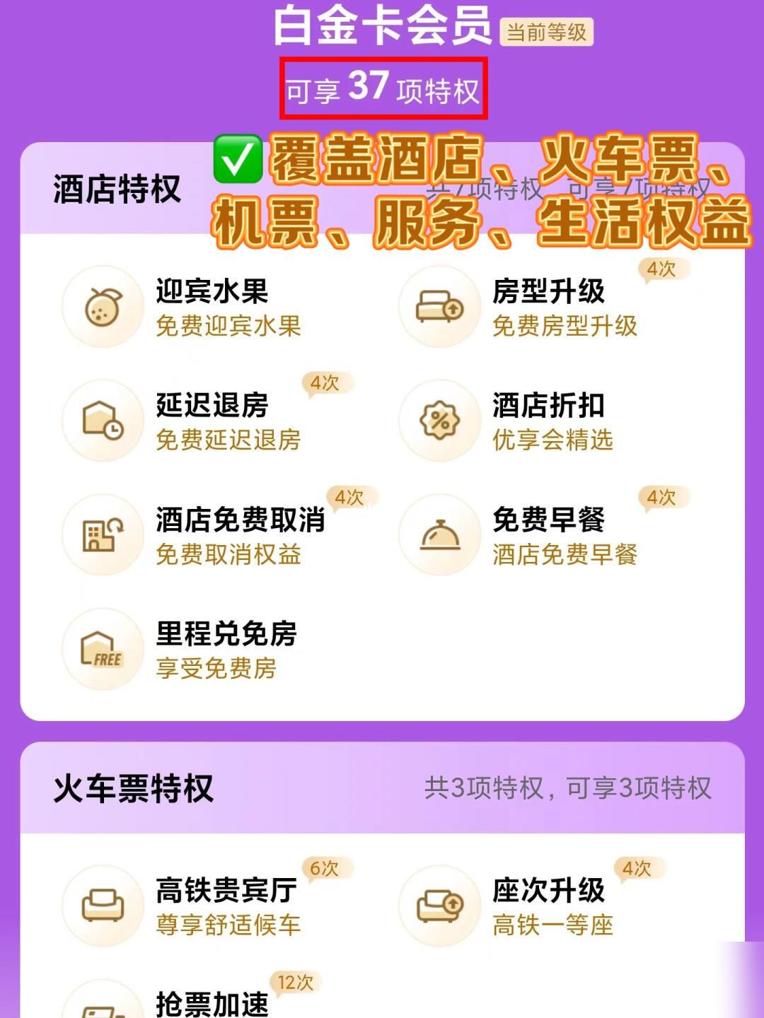 火车票特权:高铁贵宾厅(首次升白金可到领2500里程,1200里程即可兑换一次高铁贵宾厅哦)、还有-15r券,一等座升级券等等