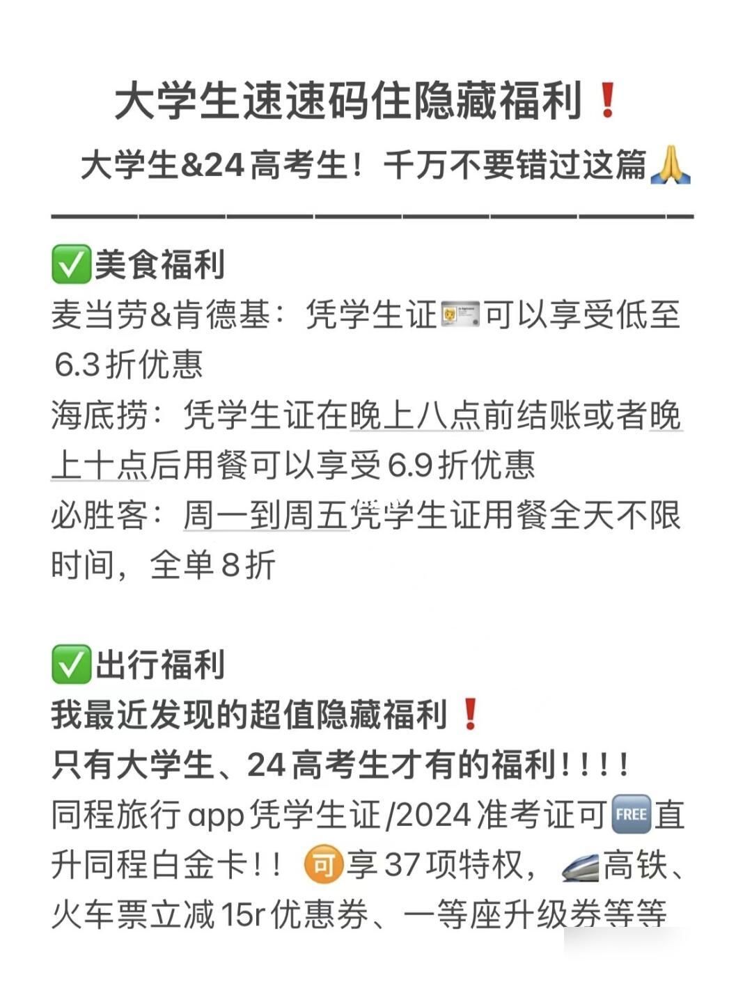 这个真真是只有大学生和24届高考考生才有的福利哦!!!一定要码住,大学期间旅游可以说是超级省钱了