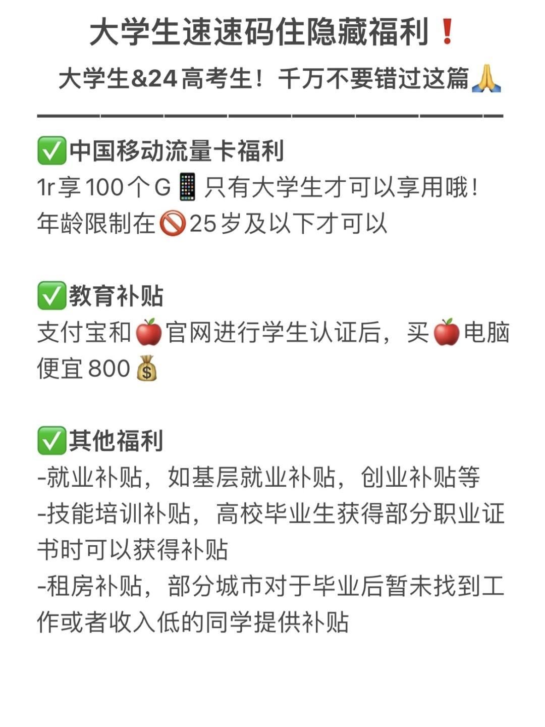 中国移动福利教育补贴其他福利,整理好放在p3了,有任何问题,可以在评论区问我哦最后祝愿24届所有高考生旗开得胜,暑假出行旅游,别忘了领取浮力!!!