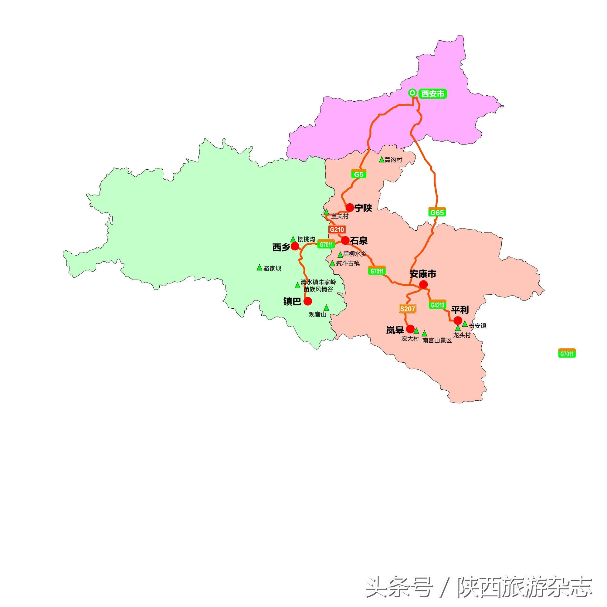 旅游线路:西安——安康——平利(龙头村、翠茗园、长安镇)——岚皋(宏大村、杨家院子、花里村、南宫山景区)——镇巴县(清水镇朱家岭苗族风情谷、观音山)——西乡(骆家坝、樱桃沟)——石泉(烫斗古镇、后柳水乡、童关村)——宁陕(蒿沟村)