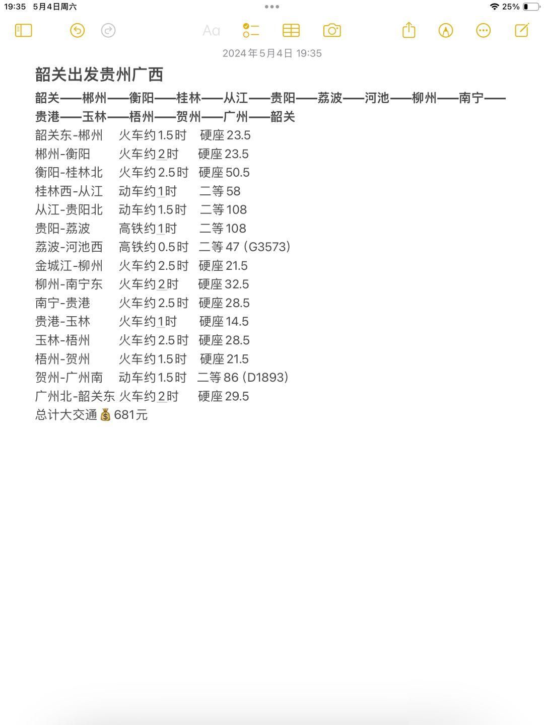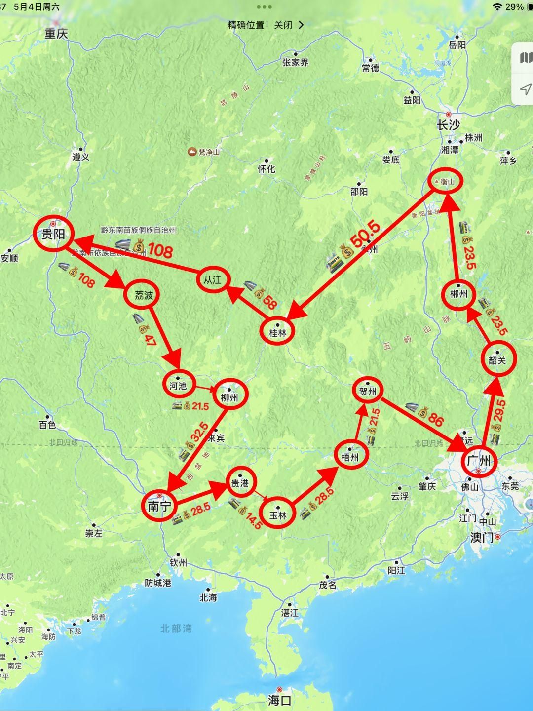 韶关郴州衡阳桂林肇兴侗寨贵阳荔波小七孔河池柳州南宁贵港玉林梧州贺州广州韶关