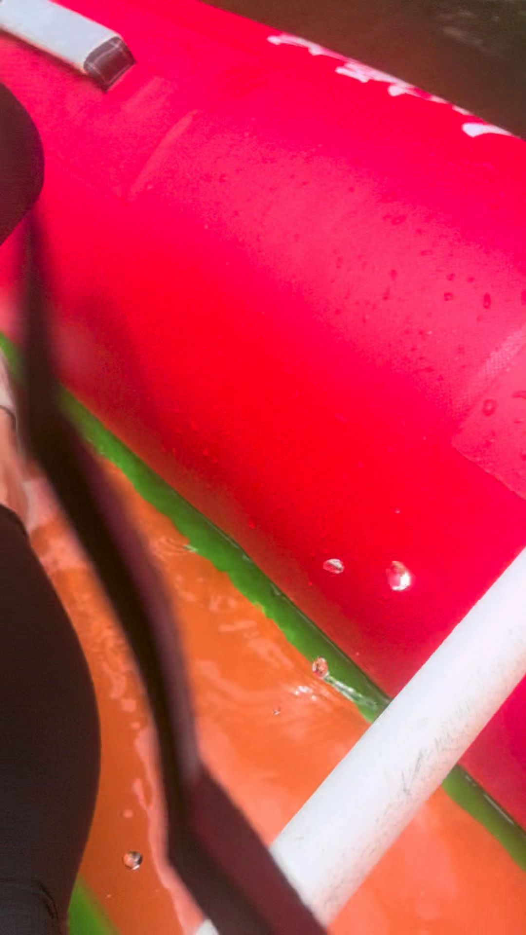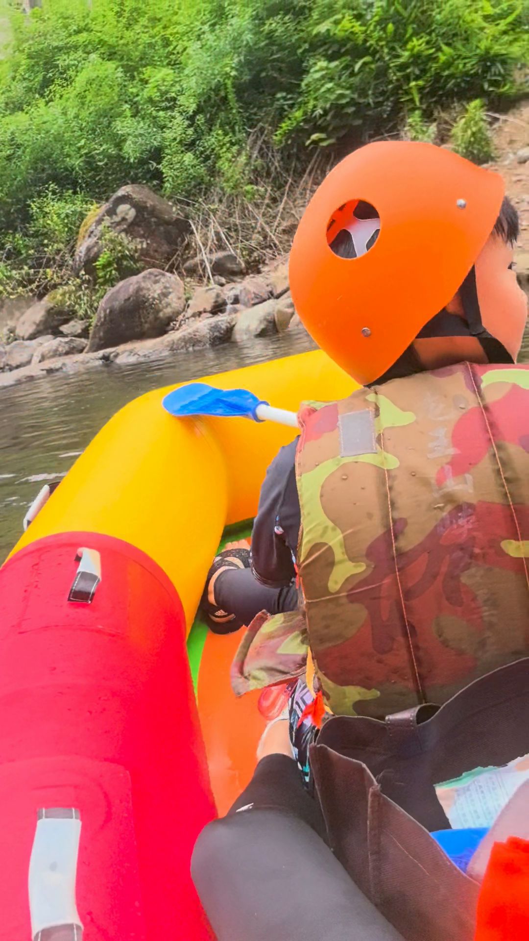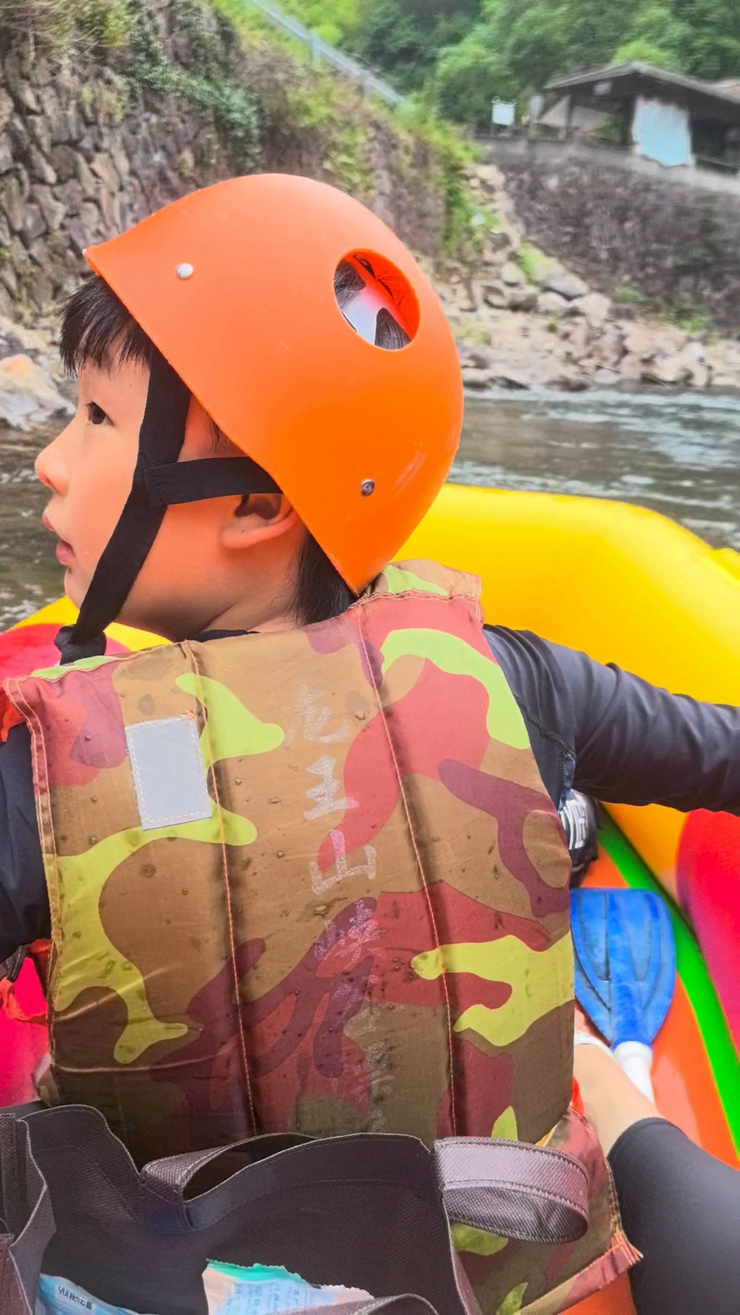 来到了漂流点,两位大侠驾轻就熟,很快就坐上皮划艇开始漂流。他现在长大了,比起以前需要我们帮忙划桨,他现在完全可以自己动手了。虽然总是给我打圈圈,一边欣赏龙王山的美景一边玩水,实在太爽啦。