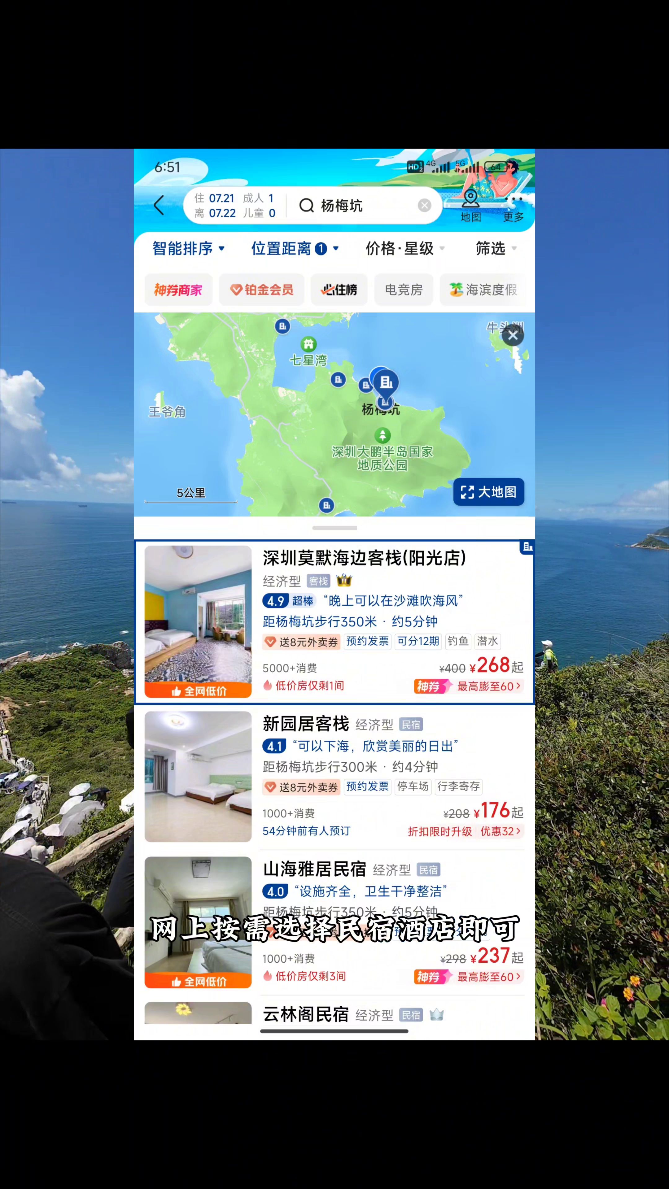 晚上推荐吃饭在鹤鼓村,家常菜价格还是挺正常的。住宿选择在杨梅坑,网上按需选择民宿酒店即可。早上定个闹钟,5点半左右(夏季),在杨梅坑沙滩追一场海上日出,追完日出回去吃早餐,休息一会。