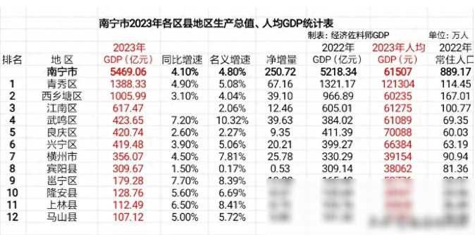 让我们把目光投向2023年的南宁市,全市GDP高达5469.06亿元,其中青秀区以1388.33亿元傲视群雄,占据了南宁市的25%。西乡塘区同样突破千亿大关,以1005.99亿元紧随其后,江南区则以617.47亿元名列第三。值得一提的是,武鸣区表现出色,超越了良庆区与兴宁区,跻身于江南区之后的第四位。横州市与宾阳县则分列第七与第八。近些年来,横州与宾阳的发展势头迅猛,尤其是宾阳,其GDP始终紧跟横州之后。